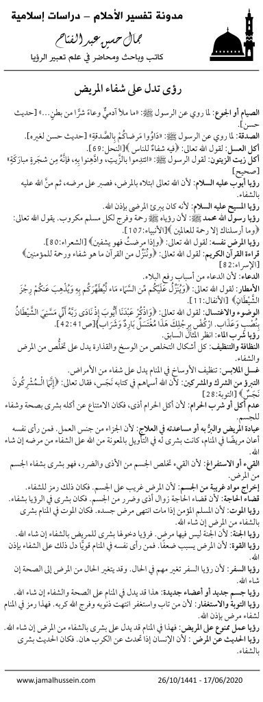 ما هي رؤى المنام التي تدل على الشفاء من المرض؟ كتبت بواسطةJamal Hussein Abdelfattah18 جوان,202026 جوان,2020نشرت تحت تصنيفغير مصنفالأوسمة:هل الرؤيا تبشر بشفاء،أحلام شفاء،أحلام شفاء مرض،تفسير أحلام،جمال حسين،جمال حسين عبد الفتاح،حلم يبشر بشفاء،رؤيا مرض،رؤيا تدل على شفاء،شفاء من مرض اشترك الآن في خدمة تعبير الرؤيا على الأصول الشرعية الإسلامية و الدورة الدراسية المتميزة في علم التعبير وفق منهج شرعي أو يمكنك دعم موقعنا أيضا شارك الموضوعالمزيد المشاركة على X (فتح في نافذة جديدة) X شارك على فيس بوك (فتح في نافذة جديدة) فيس بوك إرسال رابط بالبريد الإلكتروني إلى صديق (فتح في نافذة جديدة) البريد الإلكتروني اطبع (فتح في نافذة جديدة) طباعة المشاركة على LinkedIn (فتح في نافذة جديدة) LinkedIn المشاركة على Reddit (فتح في نافذة جديدة) Reddit مشاركة على Tumblr (فتح في نافذة جديدة) Tumblr المشاركة على Pinterest (فتح في نافذة جديدة) Pinterest إعجاب تحميل... مرتبط نُشر بواسطة Jamal Hussein Abdelfattah Dream interpretation and Ruqya specialist عرض مقالات أكثر