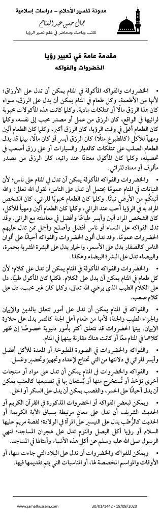مقدمة عامة في تعبير رؤيا الخضروات والفواكه في المنام كتبت بواسطةJamal Hussein Abdelfattah18 سبتمبر,202015 ديسمبر,2020نشرت تحت تصنيفغير مصنفالأوسمة:فسر حلم،فسر حلمي،معبر رؤيا،تفسير حلم،تعليم تفسير أحلام،جمال حسين،جمال حسين عبد الفتاح،حلم فواكه،حلم خضار،حلم خضروات،دورة تفسير أحلام،دورة تعبير رؤى،دورة تعبير رؤيا،رؤيا فاكهة،رؤيا خضار،علم تفسير أحلام اشترك الآن في خدمة تعبير الرؤيا على الأصول الشرعية الإسلامية و الدورة الدراسية المتميزة في علم التعبير وفق منهج شرعي أو يمكنك دعم موقعنا أيضا شارك الموضوعالمزيد النقر للمشاركة على X (فتح في نافذة جديدة) X انقر للمشاركة على فيسبوك (فتح في نافذة جديدة) فيس بوك النقر لإرسال رابط عبر البريد الإلكتروني إلى صديق (فتح في نافذة جديدة) البريد الإلكتروني اضغط للطباعة (فتح في نافذة جديدة) طباعة اضغط لتشارك على LinkedIn (فتح في نافذة جديدة) LinkedIn اضغط لمشاركة الموضوع على Reddit (فتح في نافذة جديدة) Reddit اضغط للمشاركة على Tumblr (فتح في نافذة جديدة) Tumblr اضغط للمشاركة على Pinterest (فتح في نافذة جديدة) Pinterest اضغط للمشاركة على Pocket (فتح في نافذة جديدة) Pocket إعجاب تحميل... مرتبط نُشر بواسطة Jamal Hussein Abdelfattah Dream interpretation and Ruqya specialist عرض مقالات أكثر