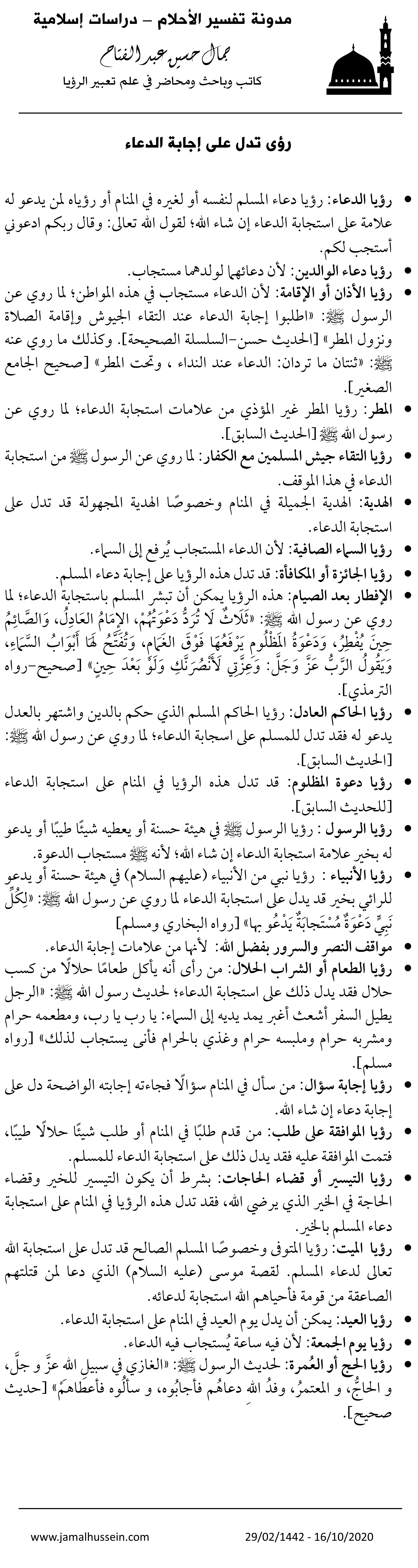 ما هي رموز الرؤى التي تدل على إجابة الدعاء؟ كتبت بواسطةJamal Hussein Abdelfattah16 أكتوبر,202018 أكتوبر,2020نشرت تحت تصنيفغير مصنفالأوسمة:معبر رؤى،الدعاء،الدعاء المستجاب،استجابة الدعاء،جمال حسين،حلم دعاء مستجاب،خدمة تعبير رؤى،رؤيا إجابة دعاء،رؤيا دعاء اشترك الآن في خدمة تعبير الرؤيا على الأصول الشرعية الإسلامية و الدورة الدراسية المتميزة في علم التعبير وفق منهج شرعي أو يمكنك دعم موقعنا أيضا شارك الموضوعالمزيد النقر للمشاركة على X (فتح في نافذة جديدة) X انقر للمشاركة على فيسبوك (فتح في نافذة جديدة) فيس بوك النقر لإرسال رابط عبر البريد الإلكتروني إلى صديق (فتح في نافذة جديدة) البريد الإلكتروني اضغط للطباعة (فتح في نافذة جديدة) طباعة اضغط لتشارك على LinkedIn (فتح في نافذة جديدة) LinkedIn اضغط لمشاركة الموضوع على Reddit (فتح في نافذة جديدة) Reddit اضغط للمشاركة على Tumblr (فتح في نافذة جديدة) Tumblr اضغط للمشاركة على Pinterest (فتح في نافذة جديدة) Pinterest اضغط للمشاركة على Pocket (فتح في نافذة جديدة) Pocket إعجاب تحميل... مرتبط نُشر بواسطة Jamal Hussein Abdelfattah Dream interpretation and Ruqya specialist عرض مقالات أكثر