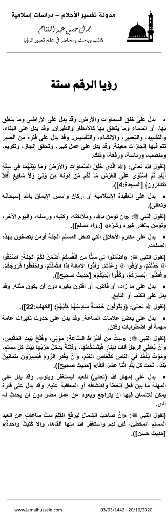 ما هو تفسير رؤيا الرقم ستة (6) في المنام؟ كتبت بواسطةJamal Hussein Abdelfattah20 أكتوبر,202020 أكتوبر,2020نشرت تحت تصنيفتفسير رموز الرؤياالأوسمة:Islam،Muslim،كورونا،مفسر أحلام،معبر رؤيا،الرقم ستة،الرقم ستة في الحلم،تعبير رؤيا،جمال حسين،جمال حسين عبد الفتاح،حلم رقم 6،حلم ستة،حلمت برقم ستة،حلمت بستة،خدمة تعبير رؤيا،رقم 6 في الرؤيا،رقم ستة في الحلم،رقية شرعية،رأيت في المنام ست،رأيت في المنام ستة،رؤيا الرقم ستة،راقي شرعي،عبارة الرؤيا اشترك الآن في خدمة تعبير الرؤيا على الأصول الشرعية الإسلامية و الدورة الدراسية المتميزة في علم التعبير وفق منهج شرعي أو يمكنك دعم موقعنا أيضا شارك الموضوعالمزيد المشاركة على X (فتح في نافذة جديدة) X شارك على فيس بوك (فتح في نافذة جديدة) فيس بوك إرسال رابط بالبريد الإلكتروني إلى صديق (فتح في نافذة جديدة) البريد الإلكتروني اطبع (فتح في نافذة جديدة) طباعة المشاركة على LinkedIn (فتح في نافذة جديدة) LinkedIn المشاركة على Reddit (فتح في نافذة جديدة) Reddit مشاركة على Tumblr (فتح في نافذة جديدة) Tumblr المشاركة على Pinterest (فتح في نافذة جديدة) Pinterest إعجاب تحميل... مرتبط نُشر بواسطة Jamal Hussein Abdelfattah Dream interpretation and Ruqya specialist عرض مقالات أكثر