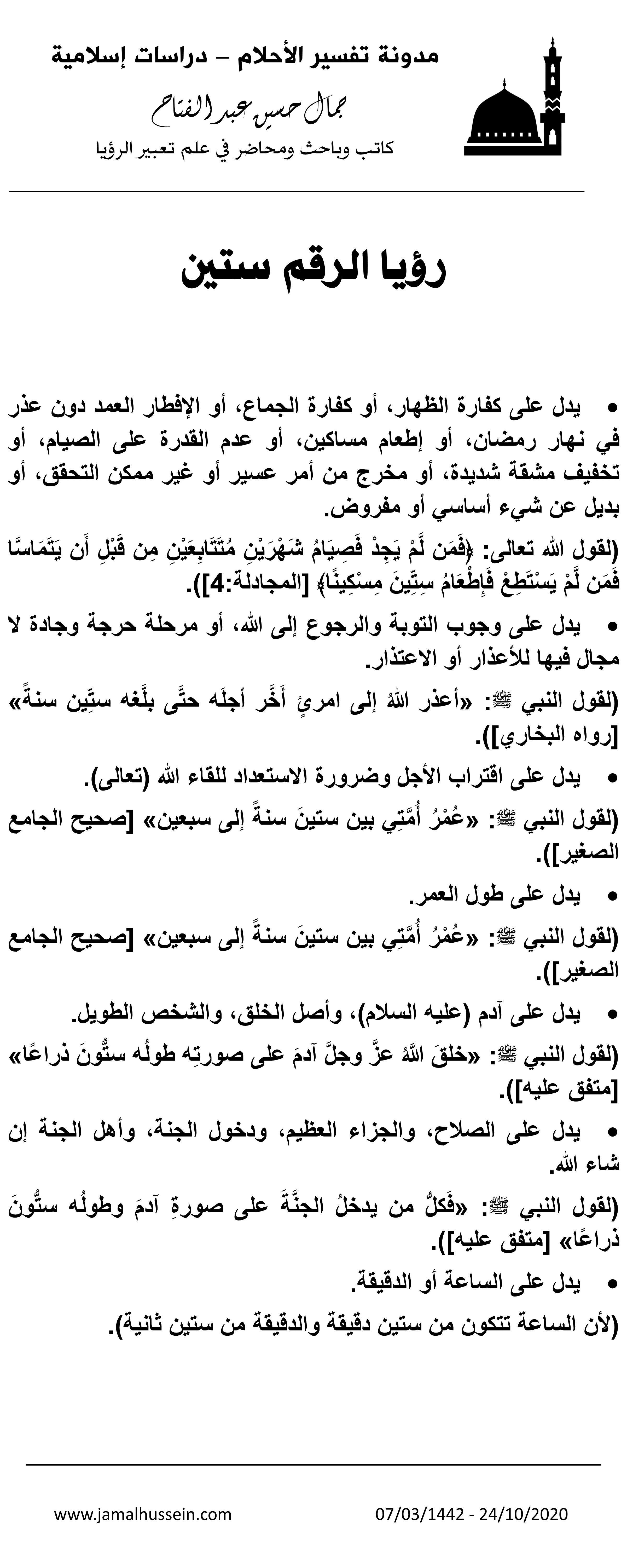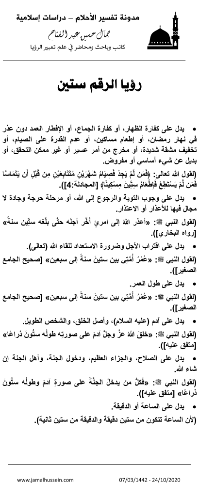 ما هو تفسير رؤيا الرقم ستين (60) في المنام؟ كتبت بواسطةJamal Hussein Abdelfattah24 أكتوبر,2020نشرت تحت تصنيفتفسير رموز الرؤياالأوسمة:مفسر أحلام،معبر رؤى،المركز الإسلامي،الرقم 60 في الحلم،جمال حسين،جمال حسين عبد الفتاح،حلم ستون،حلم ستين،حلمت بستين،رقم ستون في الرؤيا،رقم ستين في الرؤيا،رؤيا الرقم ستين،رؤيا ستين،ستين اشترك الآن في خدمة تعبير الرؤيا على الأصول الشرعية الإسلامية و الدورة الدراسية المتميزة في علم التعبير وفق منهج شرعي أو يمكنك دعم موقعنا أيضا شارك الموضوعالمزيد المشاركة على X (فتح في نافذة جديدة) X شارك على فيس بوك (فتح في نافذة جديدة) فيس بوك إرسال رابط بالبريد الإلكتروني إلى صديق (فتح في نافذة جديدة) البريد الإلكتروني اطبع (فتح في نافذة جديدة) طباعة المشاركة على LinkedIn (فتح في نافذة جديدة) LinkedIn المشاركة على Reddit (فتح في نافذة جديدة) Reddit مشاركة على Tumblr (فتح في نافذة جديدة) Tumblr المشاركة على Pinterest (فتح في نافذة جديدة) Pinterest إعجاب تحميل... مرتبط نُشر بواسطة Jamal Hussein Abdelfattah Dream interpretation and Ruqya specialist عرض مقالات أكثر