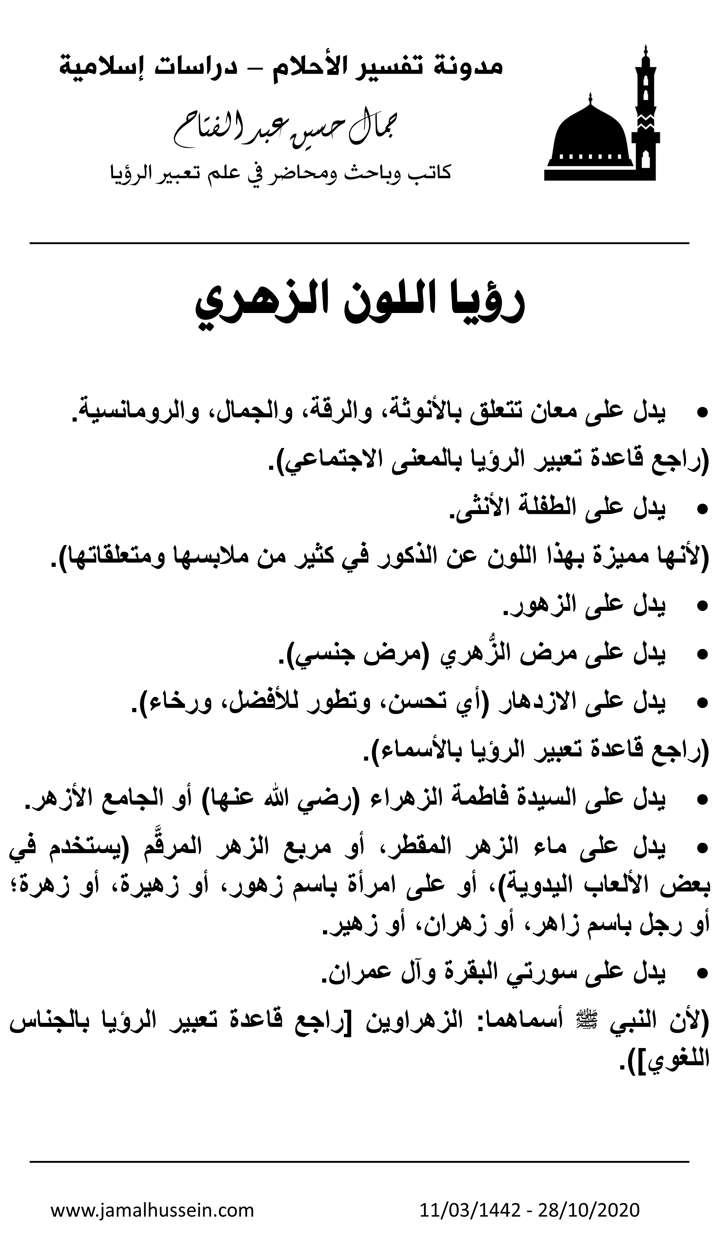 ما هو تفسير رؤيا اللون الزهري في المنام؟ كتبت بواسطةJamal Hussein Abdelfattah28 أكتوبر,202028 أكتوبر,2020نشرت تحت تصنيفتفسير رموز الرؤياالأوسمة:لون زهري،معنى لون زهري،معنى زهري في المنام،اللون الزهري في المنام،تفسير أحلام،تعبير رؤيا،جمال حسين،جمال حسين عبد الفتاح،حلمت لون زهري،رأيت لون زهري،رؤيا لون زهري اشترك الآن في خدمة تعبير الرؤيا على الأصول الشرعية الإسلامية و الدورة الدراسية المتميزة في علم التعبير وفق منهج شرعي أو يمكنك دعم موقعنا أيضا شارك الموضوعالمزيد النقر للمشاركة على X (فتح في نافذة جديدة) X انقر للمشاركة على فيسبوك (فتح في نافذة جديدة) فيس بوك النقر لإرسال رابط عبر البريد الإلكتروني إلى صديق (فتح في نافذة جديدة) البريد الإلكتروني اضغط للطباعة (فتح في نافذة جديدة) طباعة اضغط لتشارك على LinkedIn (فتح في نافذة جديدة) LinkedIn اضغط لمشاركة الموضوع على Reddit (فتح في نافذة جديدة) Reddit اضغط للمشاركة على Tumblr (فتح في نافذة جديدة) Tumblr اضغط للمشاركة على Pinterest (فتح في نافذة جديدة) Pinterest اضغط للمشاركة على Pocket (فتح في نافذة جديدة) Pocket إعجاب تحميل... مرتبط نُشر بواسطة Jamal Hussein Abdelfattah Dream interpretation and Ruqya specialist عرض مقالات أكثر