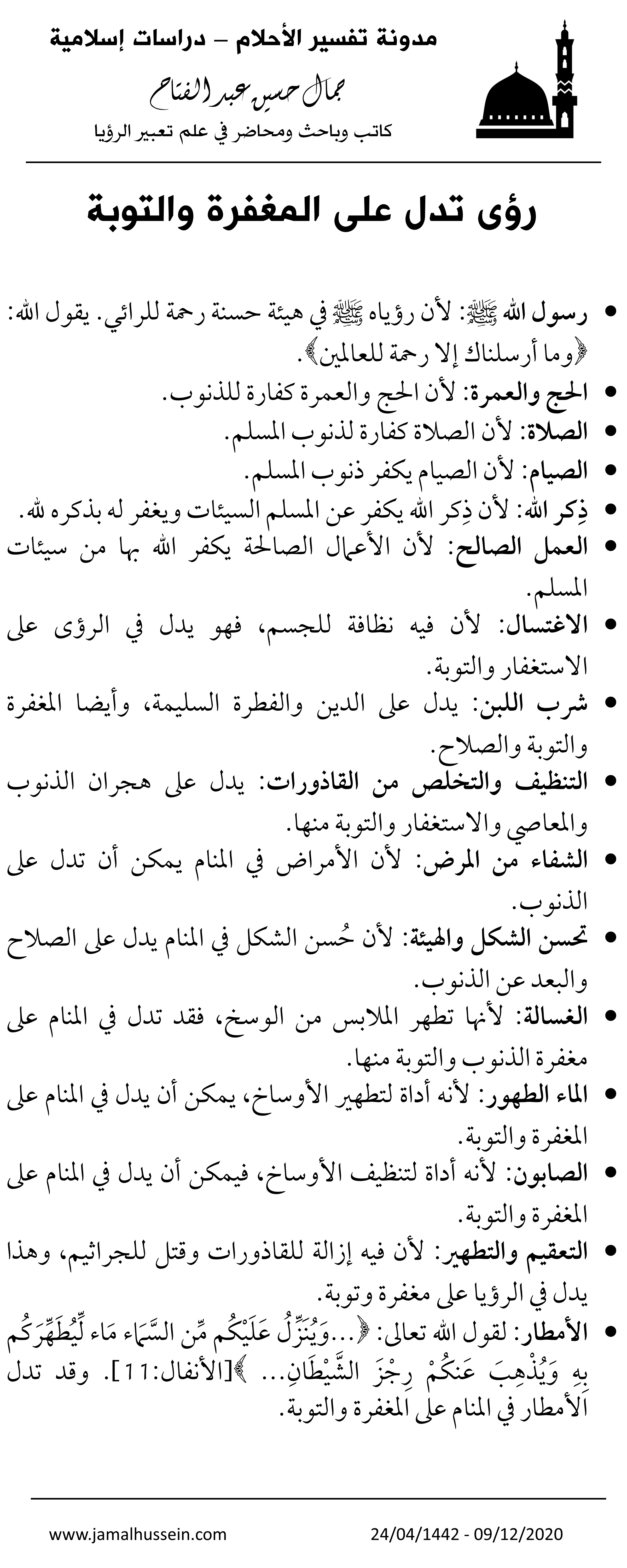 رؤى منام تدل على المغفرة والتوبة كتبت بواسطةJamal Hussein Abdelfattah9 ديسمبر,20209 ديسمبر,2020نشرت تحت تصنيفتفسير رموز الرؤيا اشترك الآن في خدمة تعبير الرؤيا على الأصول الشرعية الإسلامية و الدورة الدراسية المتميزة في علم التعبير وفق منهج شرعي أو يمكنك دعم موقعنا أيضا شارك الموضوعالمزيد النقر للمشاركة على X (فتح في نافذة جديدة) X انقر للمشاركة على فيسبوك (فتح في نافذة جديدة) فيس بوك النقر لإرسال رابط عبر البريد الإلكتروني إلى صديق (فتح في نافذة جديدة) البريد الإلكتروني اضغط للطباعة (فتح في نافذة جديدة) طباعة اضغط لتشارك على LinkedIn (فتح في نافذة جديدة) LinkedIn اضغط لمشاركة الموضوع على Reddit (فتح في نافذة جديدة) Reddit اضغط للمشاركة على Tumblr (فتح في نافذة جديدة) Tumblr اضغط للمشاركة على Pinterest (فتح في نافذة جديدة) Pinterest اضغط للمشاركة على Pocket (فتح في نافذة جديدة) Pocket إعجاب تحميل... مرتبط نُشر بواسطة Jamal Hussein Abdelfattah Dream interpretation and Ruqya specialist عرض مقالات أكثر