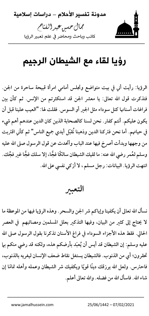 رؤيا لقاء مع الشيطان الرجيم كتبت بواسطةJamal Hussein Abdelfattah7 فيفري,20217 فيفري,2021نشرت تحت تصنيفرؤيا وتعبيرالأوسمة:تعلم تفسير حلمك،تعبير رؤيا دورة،خدمة تفسير أحلام،دورة تفسير أحلام،رؤيا جن،رؤيا سحر،رؤيا شيطان اشترك الآن في خدمة تعبير الرؤيا على الأصول الشرعية الإسلامية و الدورة الدراسية المتميزة في علم التعبير وفق منهج شرعي أو يمكنك دعم موقعنا أيضا شارك الموضوعالمزيد النقر للمشاركة على X (فتح في نافذة جديدة) X انقر للمشاركة على فيسبوك (فتح في نافذة جديدة) فيس بوك النقر لإرسال رابط عبر البريد الإلكتروني إلى صديق (فتح في نافذة جديدة) البريد الإلكتروني اضغط للطباعة (فتح في نافذة جديدة) طباعة اضغط لتشارك على LinkedIn (فتح في نافذة جديدة) LinkedIn اضغط لمشاركة الموضوع على Reddit (فتح في نافذة جديدة) Reddit اضغط للمشاركة على Tumblr (فتح في نافذة جديدة) Tumblr اضغط للمشاركة على Pinterest (فتح في نافذة جديدة) Pinterest اضغط للمشاركة على Pocket (فتح في نافذة جديدة) Pocket إعجاب تحميل... مرتبط نُشر بواسطة Jamal Hussein Abdelfattah Dream interpretation and Ruqya specialist عرض مقالات أكثر