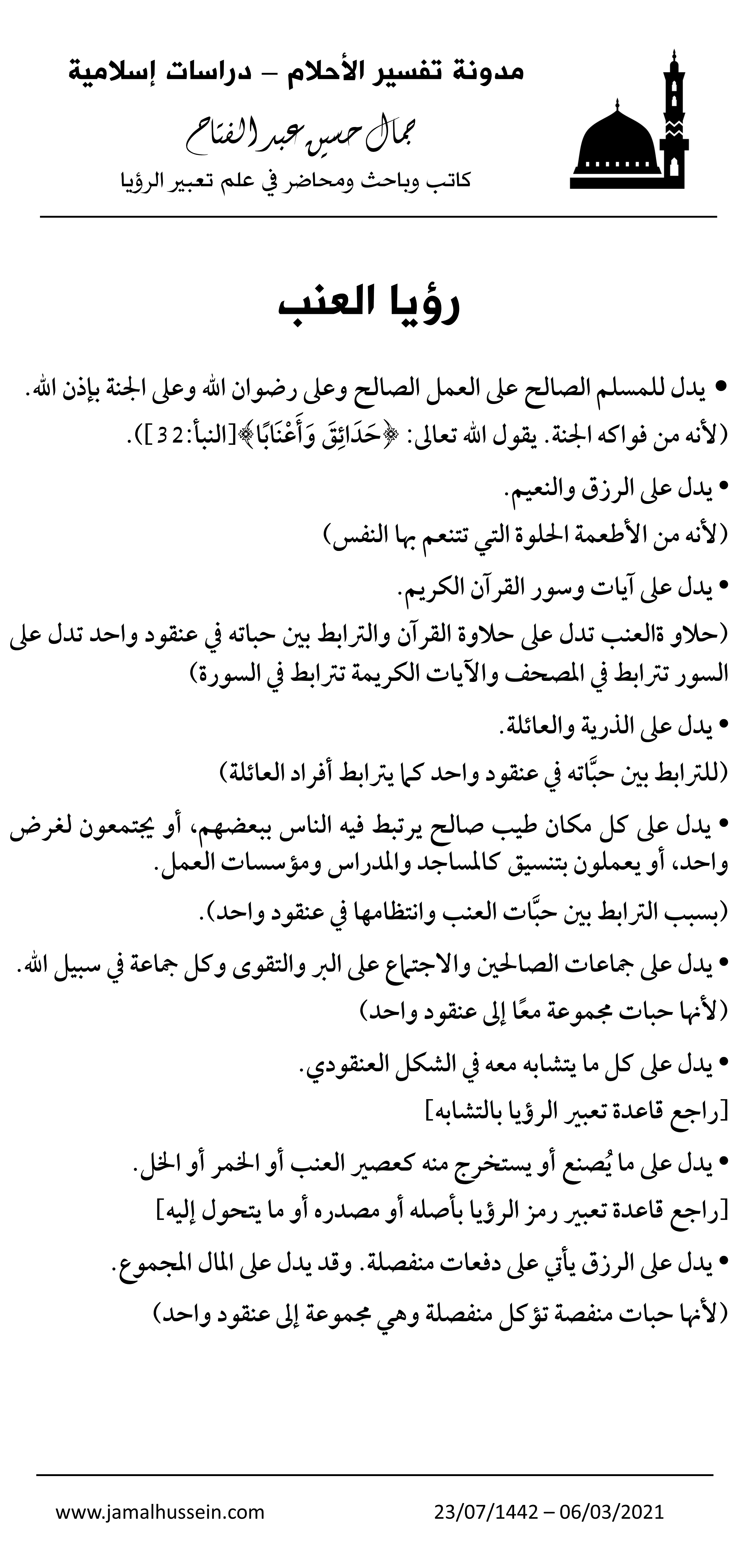 ما هو تفسير رؤيا العنب في المنام؟ كتبت بواسطةJamal Hussein Abdelfattah6 مارس,2021نشرت تحت تصنيفتفسير رموز الرؤياالأوسمة:فسر أحلامك بنفسك،كيف تفسر حلمك،مفسر أحلام،معبر رؤى،العنب في الرؤيا،تفسير أحلام،تعبير رؤيا،جمال حسين،حلم عنب،حلمت بالعنب،خدمة تعبير رؤيا،رؤيا عنب،عنقود عنب في المنام،عنب اشترك الآن في خدمة تعبير الرؤيا على الأصول الشرعية الإسلامية و الدورة الدراسية المتميزة في علم التعبير وفق منهج شرعي أو يمكنك دعم موقعنا أيضا شارك الموضوعالمزيد النقر للمشاركة على X (فتح في نافذة جديدة) X انقر للمشاركة على فيسبوك (فتح في نافذة جديدة) فيس بوك النقر لإرسال رابط عبر البريد الإلكتروني إلى صديق (فتح في نافذة جديدة) البريد الإلكتروني اضغط للطباعة (فتح في نافذة جديدة) طباعة اضغط لتشارك على LinkedIn (فتح في نافذة جديدة) LinkedIn اضغط لمشاركة الموضوع على Reddit (فتح في نافذة جديدة) Reddit اضغط للمشاركة على Tumblr (فتح في نافذة جديدة) Tumblr اضغط للمشاركة على Pinterest (فتح في نافذة جديدة) Pinterest اضغط للمشاركة على Pocket (فتح في نافذة جديدة) Pocket إعجاب تحميل... مرتبط نُشر بواسطة Jamal Hussein Abdelfattah Dream interpretation and Ruqya specialist عرض مقالات أكثر