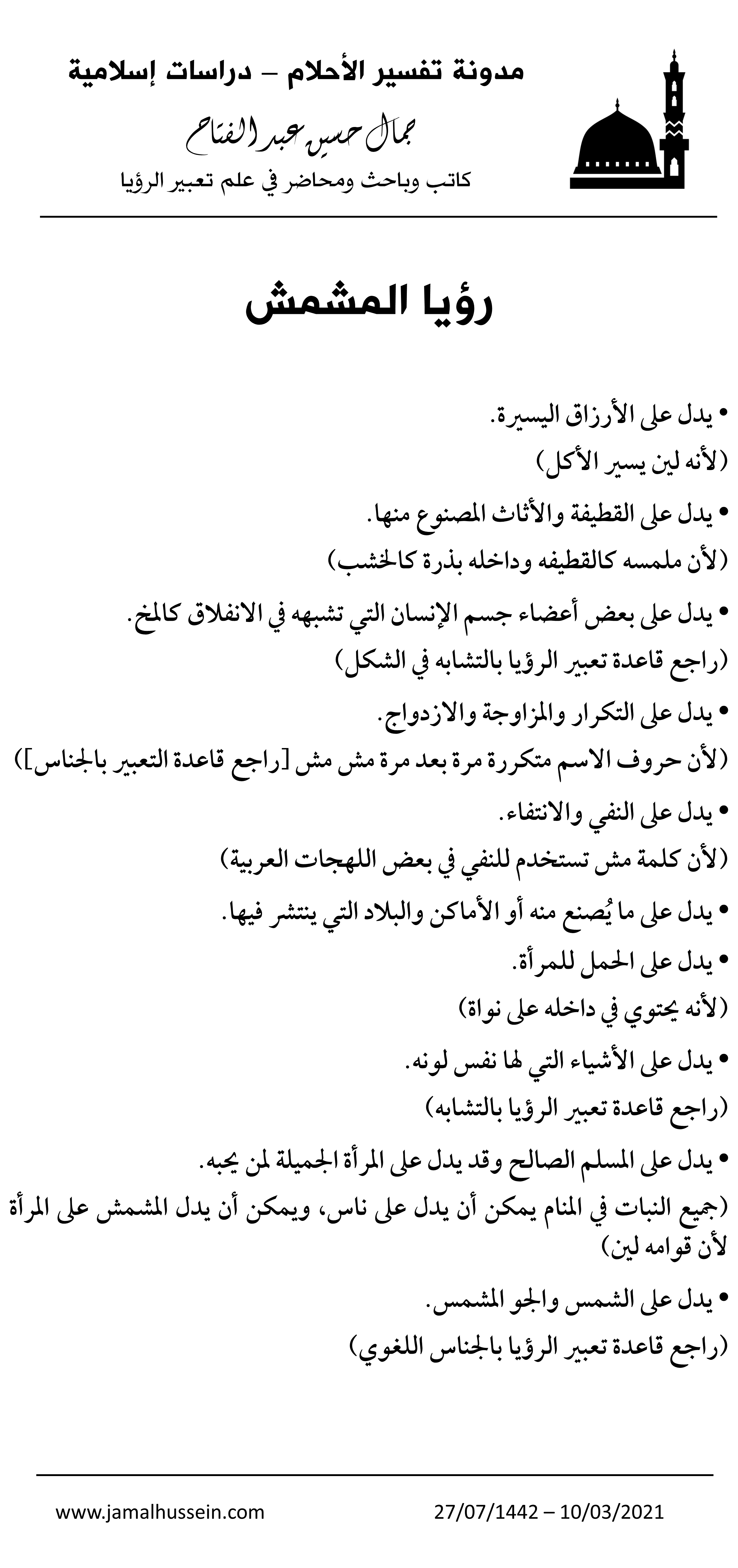 ما هو تفسير رؤيا المشمش في المنام؟ كتبت بواسطةJamal Hussein Abdelfattah10 مارس,202110 مارس,2021نشرت تحت تصنيفتفسير رموز الرؤياالأوسمة:مشمش،المشمش في المنام،تفسير أحلام،تعبير رؤيا،جمال حسين،حلم مشمش،حلم المشمش،حلمت بمشمش،رؤيا مشمش اشترك الآن في خدمة تعبير الرؤيا على الأصول الشرعية الإسلامية و الدورة الدراسية المتميزة في علم التعبير وفق منهج شرعي أو يمكنك دعم موقعنا أيضا شارك الموضوعالمزيد النقر للمشاركة على X (فتح في نافذة جديدة) X انقر للمشاركة على فيسبوك (فتح في نافذة جديدة) فيس بوك النقر لإرسال رابط عبر البريد الإلكتروني إلى صديق (فتح في نافذة جديدة) البريد الإلكتروني اضغط للطباعة (فتح في نافذة جديدة) طباعة اضغط لتشارك على LinkedIn (فتح في نافذة جديدة) LinkedIn اضغط لمشاركة الموضوع على Reddit (فتح في نافذة جديدة) Reddit اضغط للمشاركة على Tumblr (فتح في نافذة جديدة) Tumblr اضغط للمشاركة على Pinterest (فتح في نافذة جديدة) Pinterest اضغط للمشاركة على Pocket (فتح في نافذة جديدة) Pocket إعجاب تحميل... مرتبط نُشر بواسطة Jamal Hussein Abdelfattah Dream interpretation and Ruqya specialist عرض مقالات أكثر