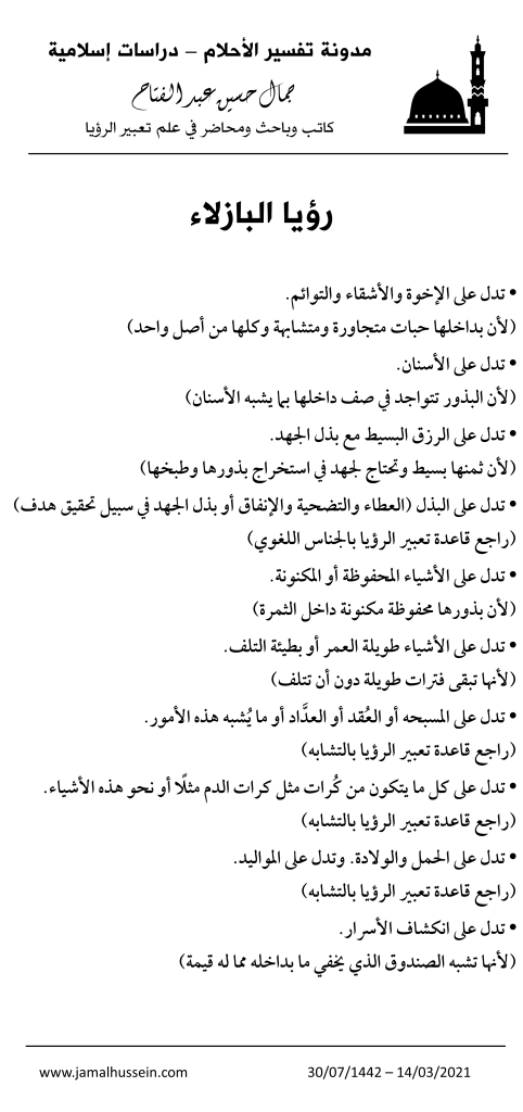 ما هو تفسير رؤيا البازلاء في المنام؟ كتبت بواسطةJamal Hussein Abdelfattah14 مارس,202114 مارس,2021نشرت تحت تصنيفتفسير رموز الرؤياالأوسمة:مفسر أحلام،تعبير رؤيا،جمال حسين،حلم،حلم يسلة،حلم بازلاء،حلم بسلة،حلم جلبانه،حلمت بازلاء،خدمة تعبير رؤيا،رأيت بازلا،رأيت بازلاء،رؤيا بازلا،رؤيا بازلاء،رؤيا جلبان،رؤيا جلبانه اشترك الآن في خدمة تعبير الرؤيا على الأصول الشرعية الإسلامية و الدورة الدراسية المتميزة في علم التعبير وفق منهج شرعي أو يمكنك دعم موقعنا أيضا شارك الموضوعالمزيد المشاركة على X (فتح في نافذة جديدة) X شارك على فيس بوك (فتح في نافذة جديدة) فيس بوك إرسال رابط بالبريد الإلكتروني إلى صديق (فتح في نافذة جديدة) البريد الإلكتروني اطبع (فتح في نافذة جديدة) طباعة المشاركة على LinkedIn (فتح في نافذة جديدة) LinkedIn المشاركة على Reddit (فتح في نافذة جديدة) Reddit مشاركة على Tumblr (فتح في نافذة جديدة) Tumblr المشاركة على Pinterest (فتح في نافذة جديدة) Pinterest إعجاب تحميل... مرتبط نُشر بواسطة Jamal Hussein Abdelfattah Dream interpretation and Ruqya specialist عرض مقالات أكثر
