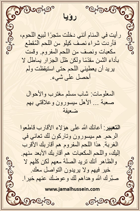 رؤيا اللحم في المنام قد يدل على الأقارب كتبت بواسطةJamal Hussein Abdelfattah16 جانفي,2022نشرت تحت تصنيفرؤيا وتعبيرالأوسمة:قطر،مفسر أحلام،معبر رؤيا،الكويت،البحرين،السعودية،تفسير أحلام،تعبير رؤيا،جمال حسين،خدمة تفسير أحلام،دورة تفسير أحلام اشترك الآن في خدمة تعبير الرؤيا على الأصول الشرعية الإسلامية و الدورة الدراسية المتميزة في علم التعبير وفق منهج شرعي أو يمكنك دعم موقعنا أيضا شارك الموضوعالمزيد النقر للمشاركة على X (فتح في نافذة جديدة) X انقر للمشاركة على فيسبوك (فتح في نافذة جديدة) فيس بوك النقر لإرسال رابط عبر البريد الإلكتروني إلى صديق (فتح في نافذة جديدة) البريد الإلكتروني اضغط للطباعة (فتح في نافذة جديدة) طباعة اضغط لتشارك على LinkedIn (فتح في نافذة جديدة) LinkedIn اضغط لمشاركة الموضوع على Reddit (فتح في نافذة جديدة) Reddit اضغط للمشاركة على Tumblr (فتح في نافذة جديدة) Tumblr اضغط للمشاركة على Pinterest (فتح في نافذة جديدة) Pinterest اضغط للمشاركة على Pocket (فتح في نافذة جديدة) Pocket إعجاب تحميل... مرتبط نُشر بواسطة Jamal Hussein Abdelfattah Dream interpretation and Ruqya specialist عرض مقالات أكثر