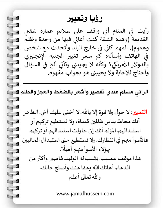 رؤيا تبديل العملات تدل على ضغوط مؤلمة كتبت بواسطةJamal Hussein Abdelfattah11 جوان,2022نشرت تحت تصنيفرؤيا وتعبيرالأوسمة:قطر،مفسر أحلام،معبر رؤيا،الكويت،الإمارات،البحرين،السعودية،تفسير أحلام،تعبير رؤيا،جمال حسين اشترك الآن في خدمة تعبير الرؤيا على الأصول الشرعية الإسلامية و الدورة الدراسية المتميزة في علم التعبير وفق منهج شرعي أو يمكنك دعم موقعنا أيضا شارك الموضوعالمزيد المشاركة على X (فتح في نافذة جديدة) X شارك على فيس بوك (فتح في نافذة جديدة) فيس بوك إرسال رابط بالبريد الإلكتروني إلى صديق (فتح في نافذة جديدة) البريد الإلكتروني اطبع (فتح في نافذة جديدة) طباعة المشاركة على LinkedIn (فتح في نافذة جديدة) LinkedIn المشاركة على Reddit (فتح في نافذة جديدة) Reddit مشاركة على Tumblr (فتح في نافذة جديدة) Tumblr المشاركة على Pinterest (فتح في نافذة جديدة) Pinterest إعجاب تحميل... مرتبط نُشر بواسطة Jamal Hussein Abdelfattah Dream interpretation and Ruqya specialist عرض مقالات أكثر