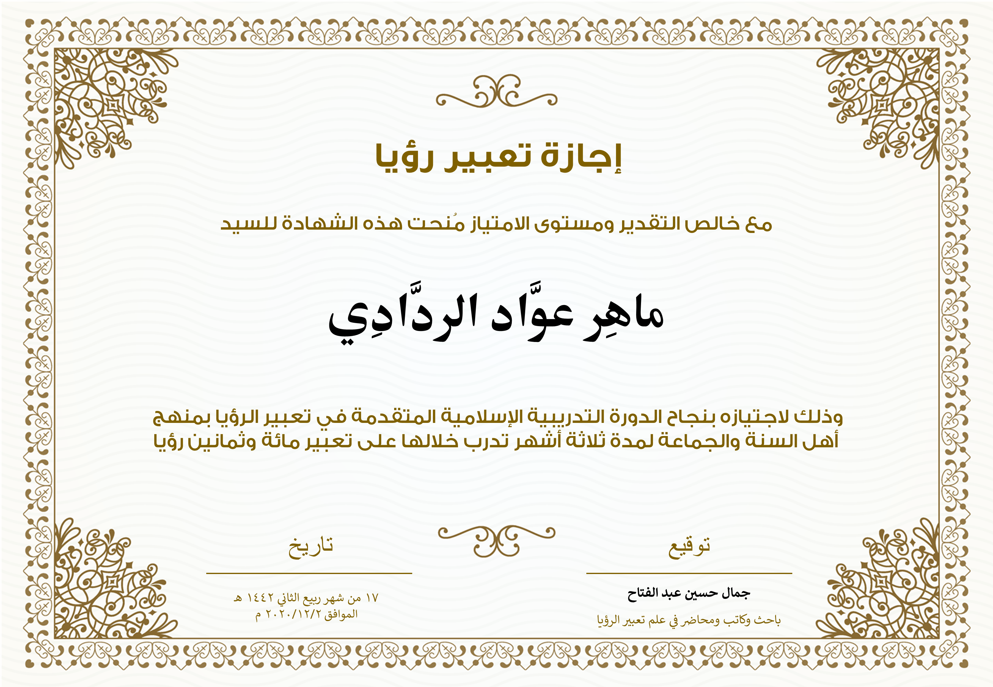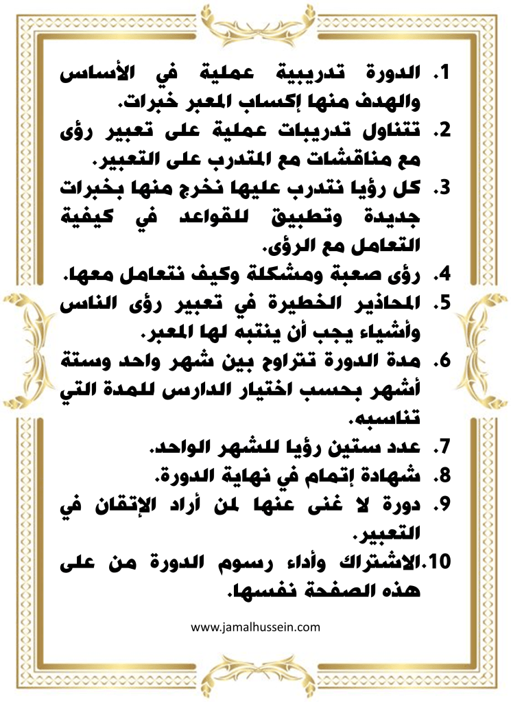 أتشرف بالإعلان عن بدء الدورات الدراسية المتقدمة في تعبير الرؤيا إن شاء الله. الدورة مخصصة لمن اجتازوا الدورة الأساسية في تعبير الرؤيا أو من لديهم علم جيد بتعبير الرؤيا في الإسلام وقواعده. وتفاصيل الدورة كالتالي: